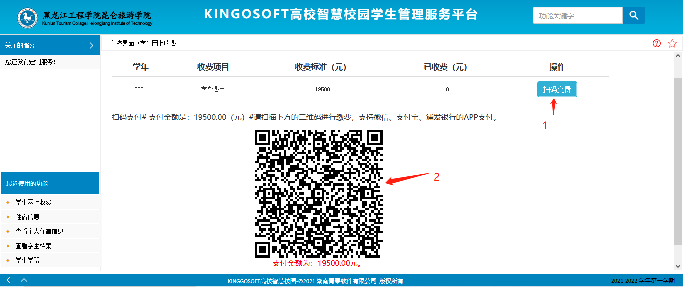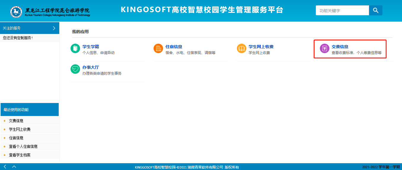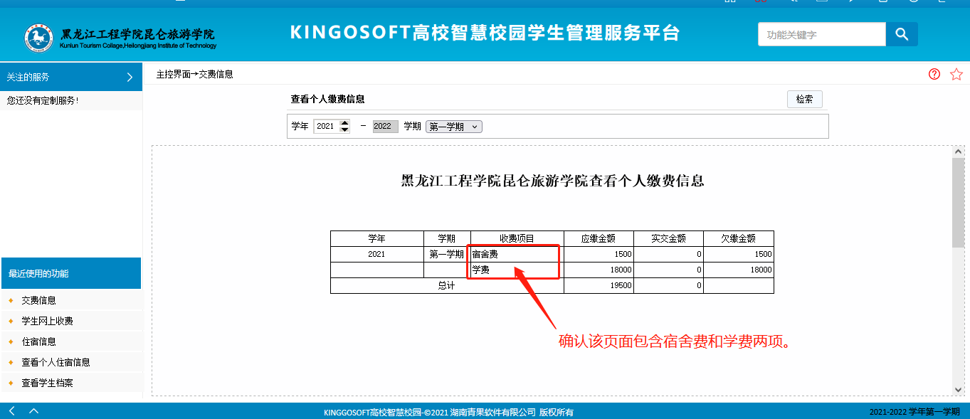 3.看缴费信息。备注:确认自己应交的费用,包含两项,即:住宿费,学费。如果只显示一项费用,需要联系学校老师进行咨询。
