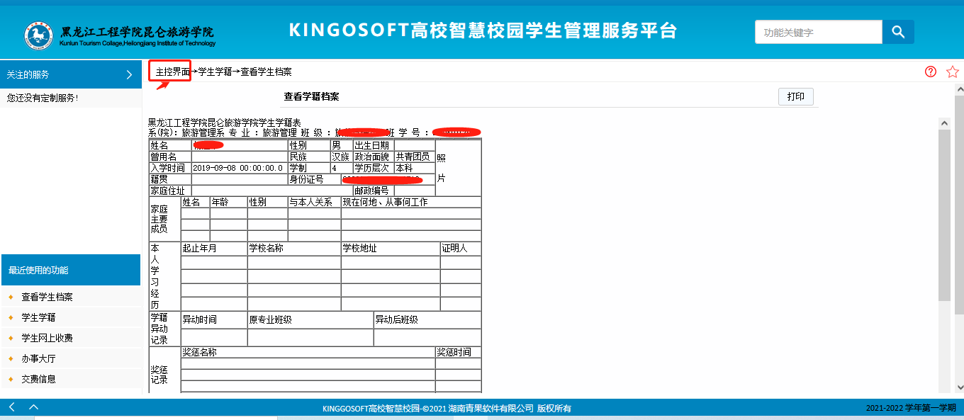 (2)点击查看学生档案;主要核对自己姓名、所属系部、专业、班级、学号、身份证号等信息。如果无误,点击“主控界面”回到主界面。如果信息有误,可以打电话联系学校辅导员老师进行反馈。