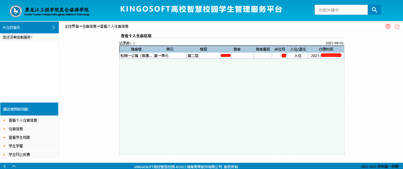 (2)点击查看个人住宿信息;主要核对宿舍楼、单元、楼层、宿舍、床位号。如果无误,点击“主控界面”回到主界面。如果信息有误,可以打电话联系学校辅导员老师进行反馈。