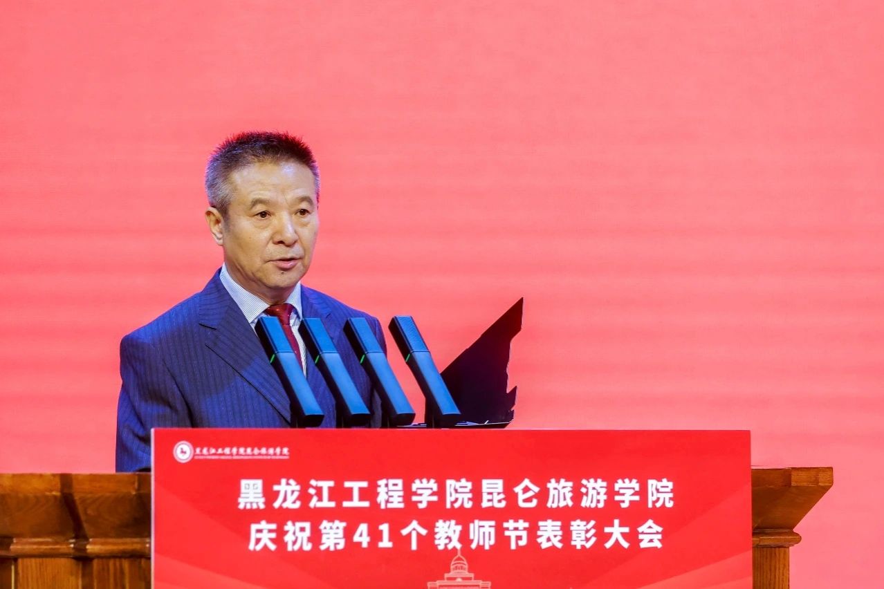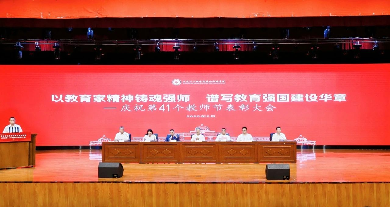 金秋九月,桃李芬芳。9月10日下午,学校庆祝第41个教师节表彰大会在群观楼5楼报告厅举行。大会以"以教育家精神铸魂强师·谱写教育强国建设华章"为主题,理事长王为正,党委书记刘金伟,校长李英杰,党委副书记、执行校长栾天,党委副书记、副校长武录齐,校长助理王岩、陈国良、双兆春等领导出席大会。全体教职工和学生代表齐聚一堂,共同庆祝这个属于教育工作者的崇高节日。大会由武录齐主持。