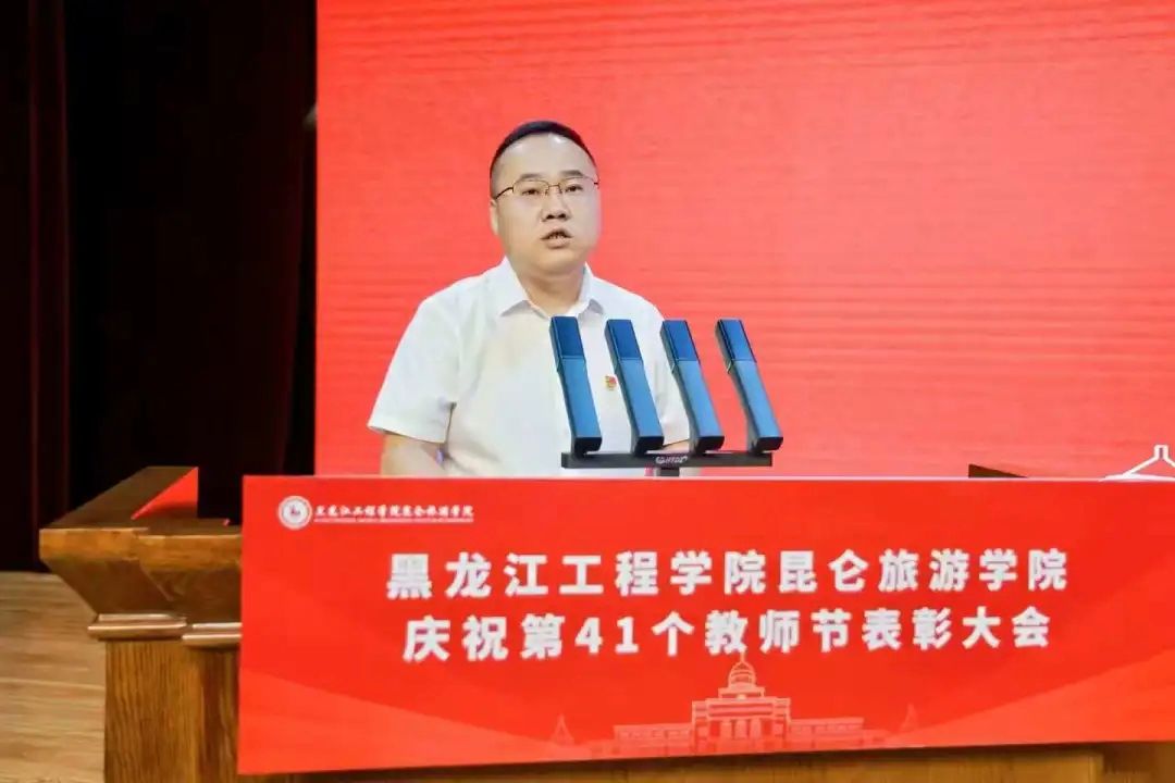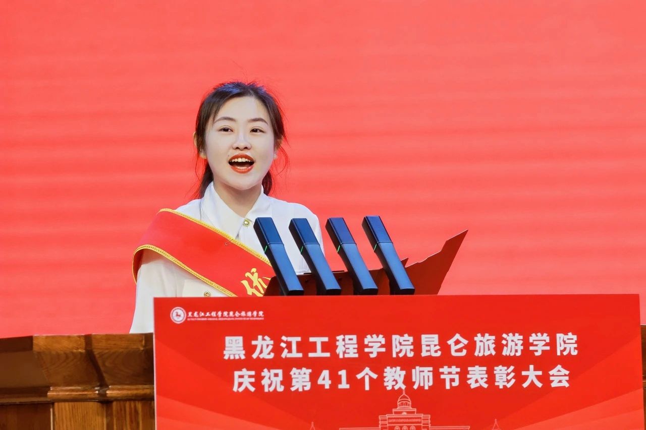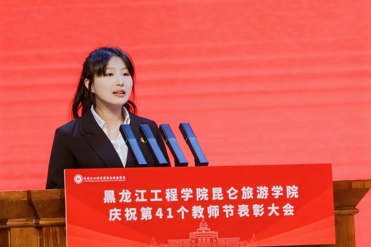优秀教师代表外语系徐英彤在发言时说道:“教育是一场双向奔赴的温暖旅程,是用生命感染生命、用灵魂唤醒灵魂的过程。我们将始终以教育家精神为指引,用爱心与智慧照亮学生前行的道路,努力成为学生为学、为事、为人道路上的引路人与‘大先生’。”