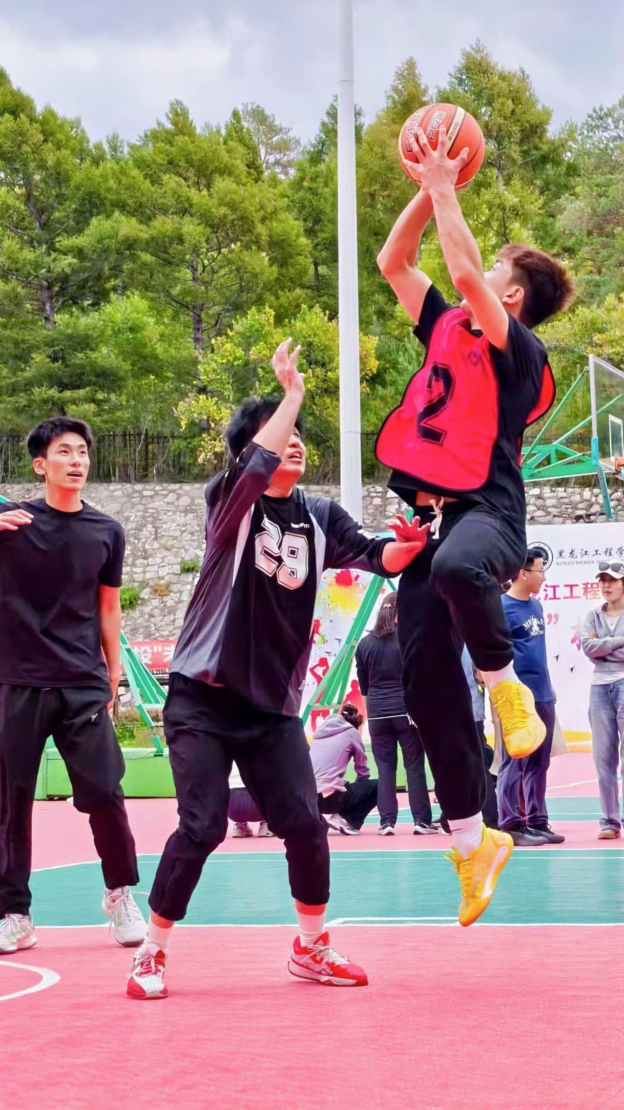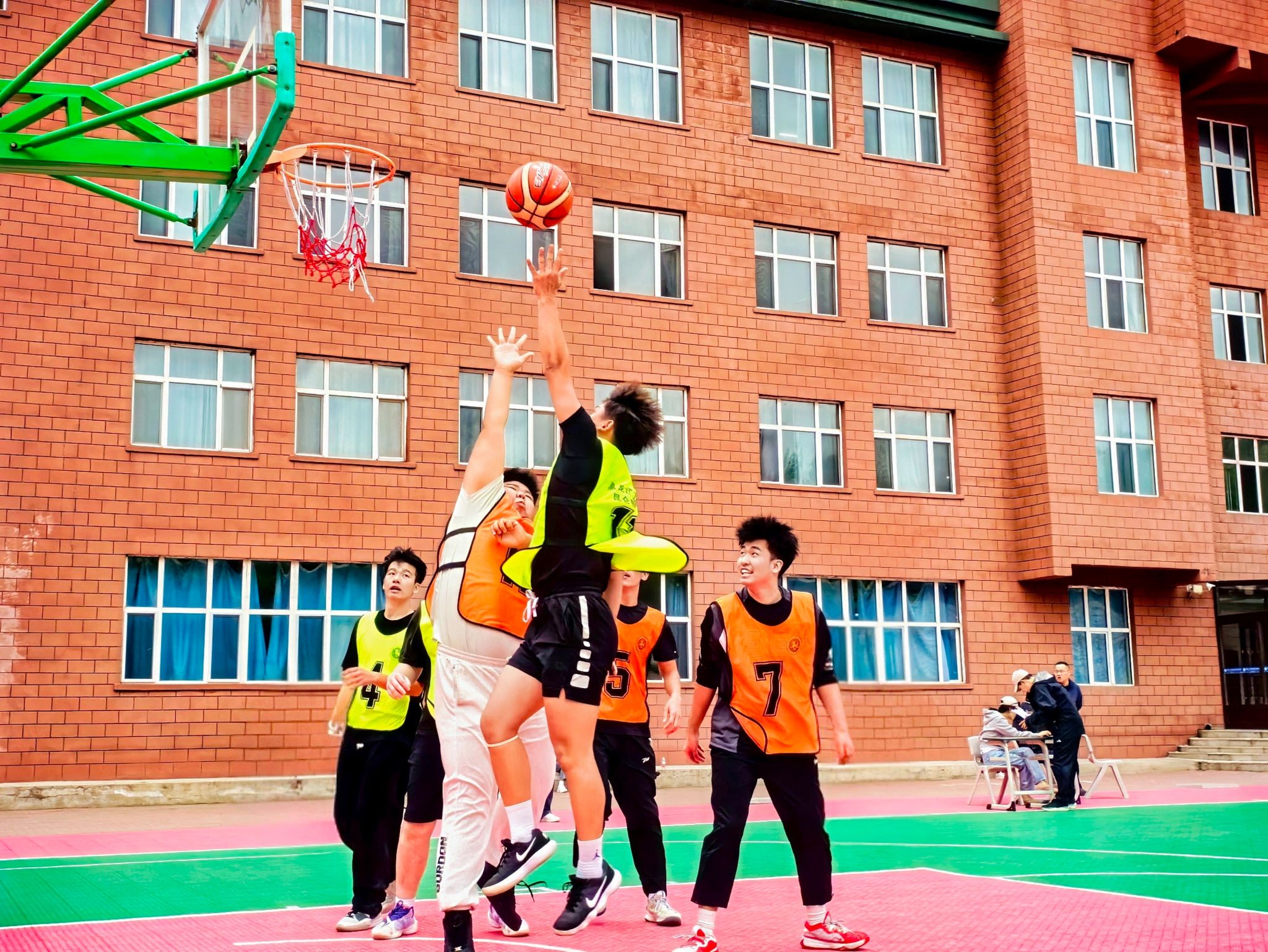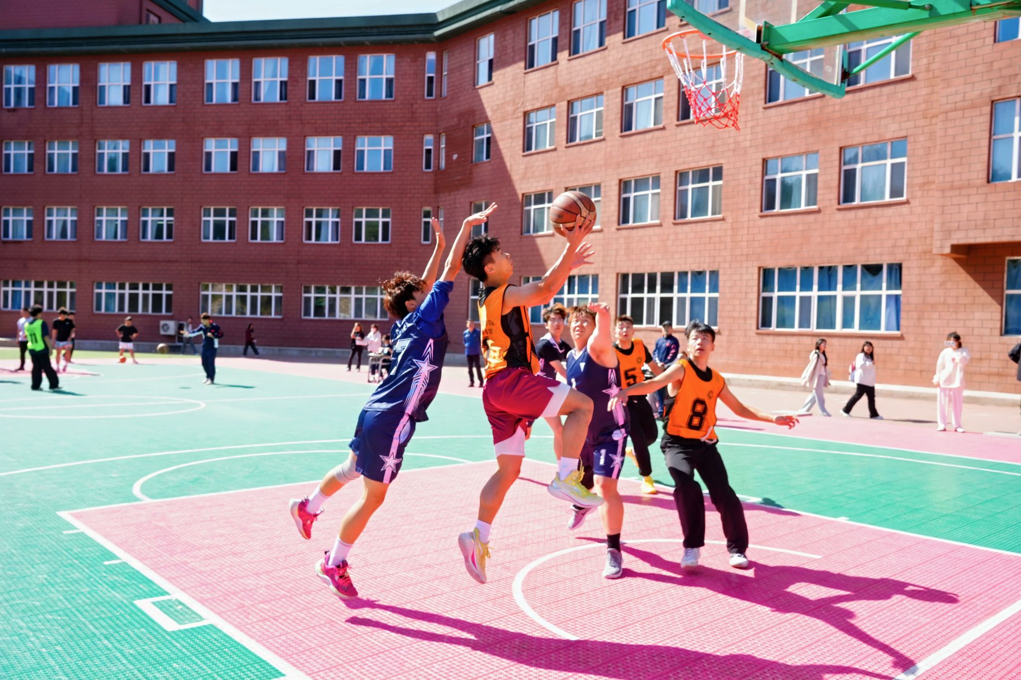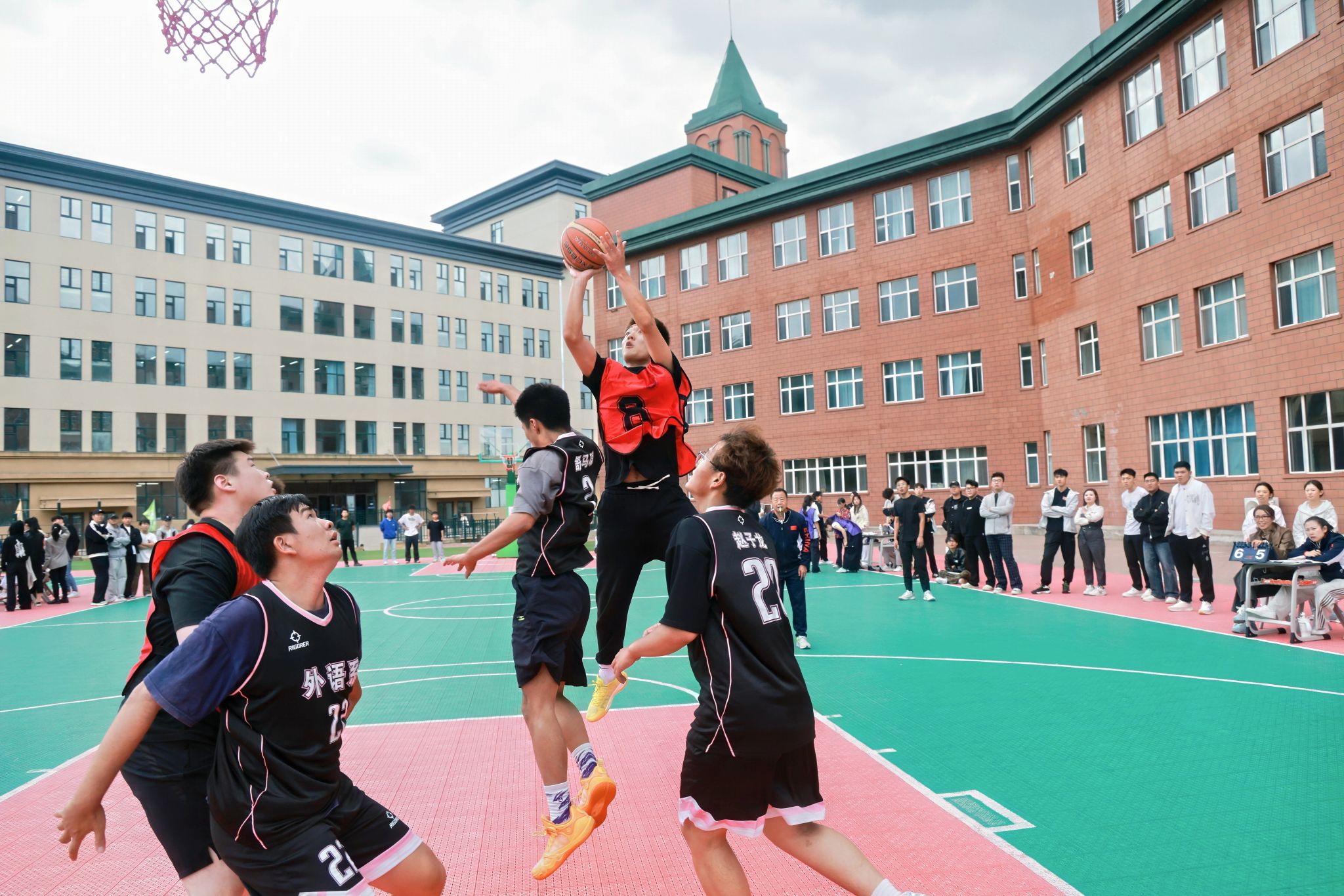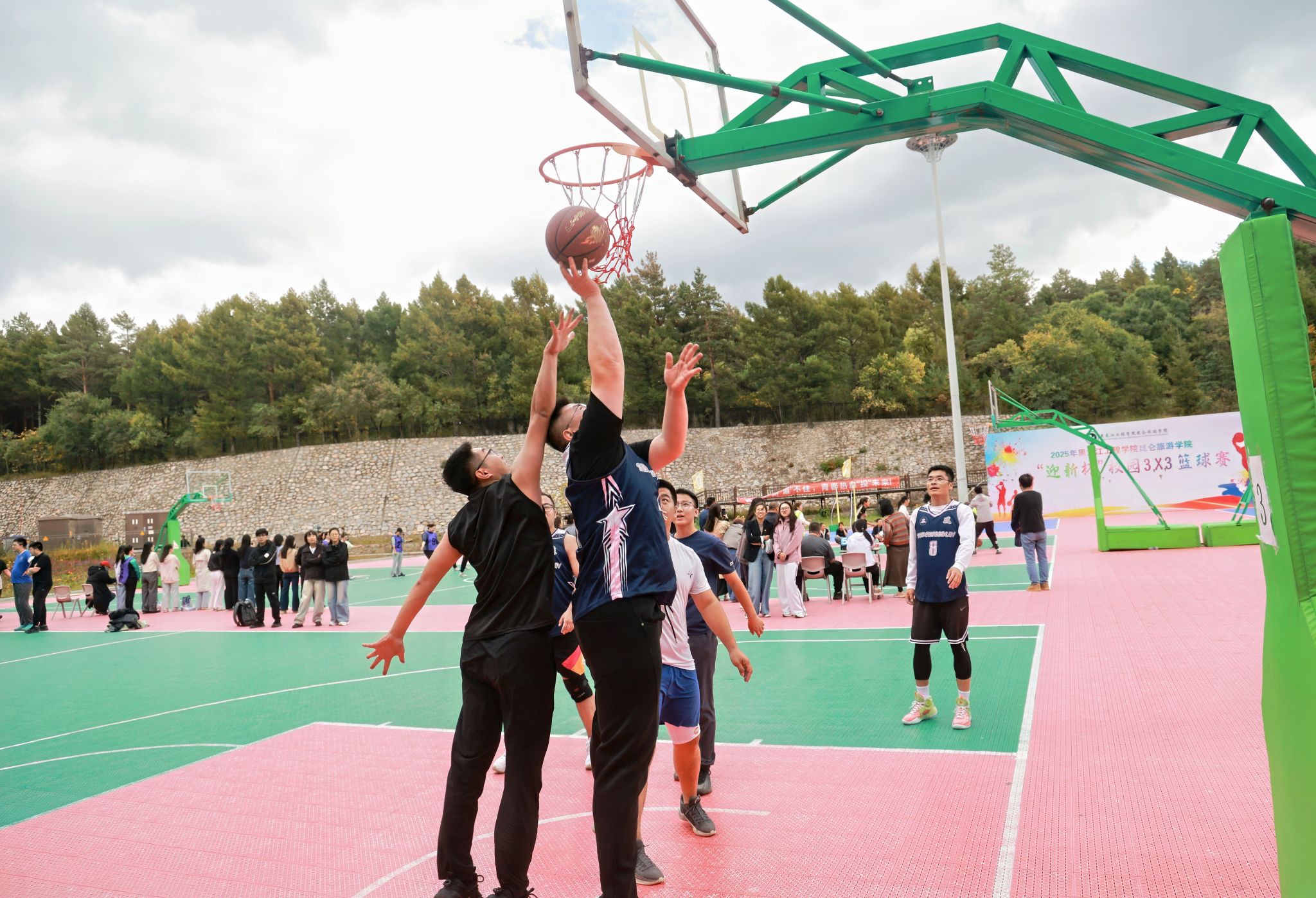 自9月15日起,每日午间的篮球场都焕发着勃勃生机。教工组的比赛中,老师们展现出课堂外的别样风采。一位老师稳健地运球突破,巧妙分球给同事,后者果断跳投命中,引得场边学生连连叫好。新生组的赛场更是朝气蓬勃,男生们奋力拼抢篮板,女生们精准投篮得分。场边围满了观众,有捧着课本驻足观看的同学,有下课路过被精彩对决吸引的辅导员。每一次精彩的传球配合,每一个漂亮的进球,都会引发阵阵掌声与欢呼。