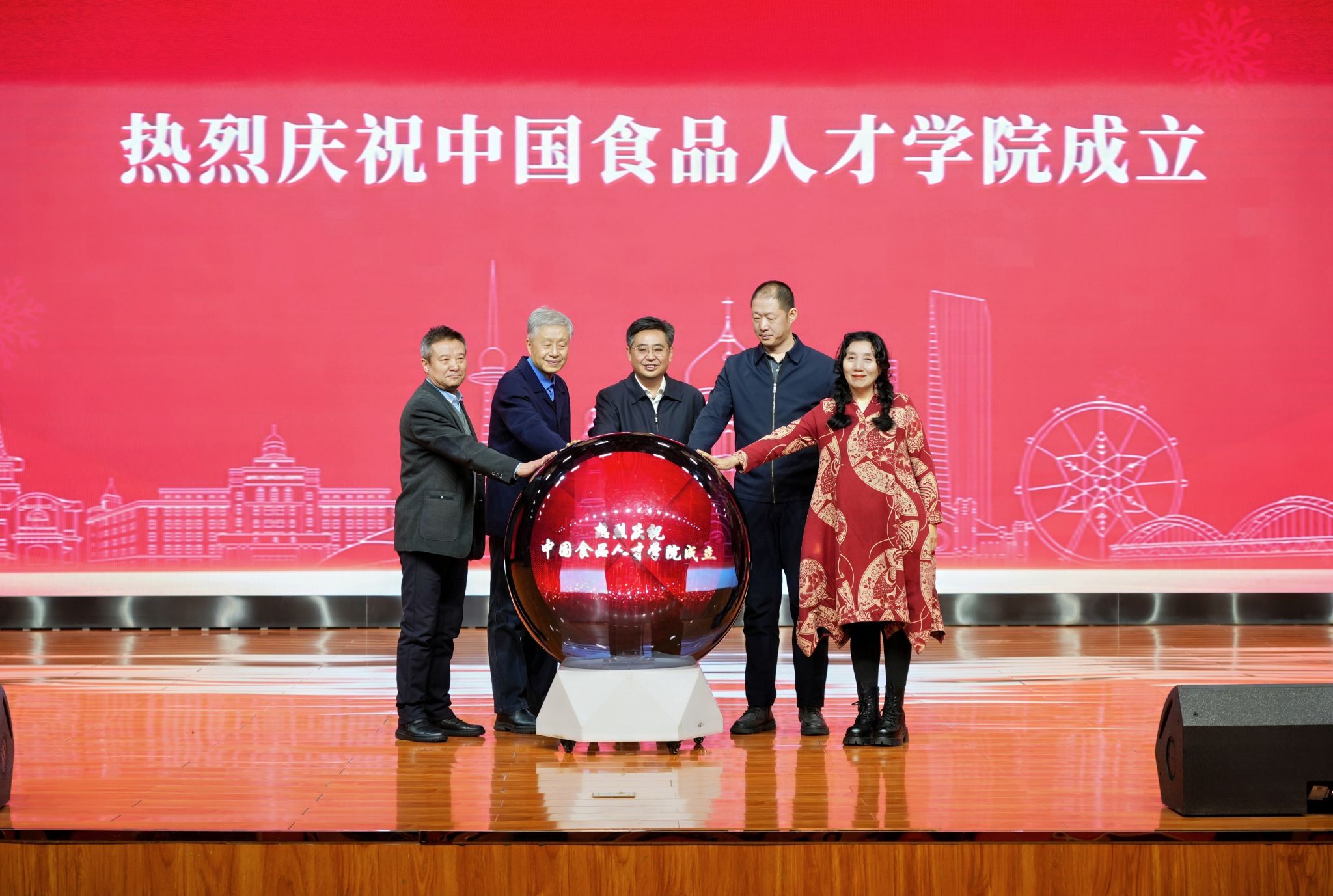 在启动仪式环节,黄国胜、崔志伟、王为正、李英杰、阿紫共同按下象征希望与未来的启动球,共同见证中国食品人才学院成立。随后举行了院长聘书颁发仪式,黄国胜社长为阿紫院长颁发聘书。