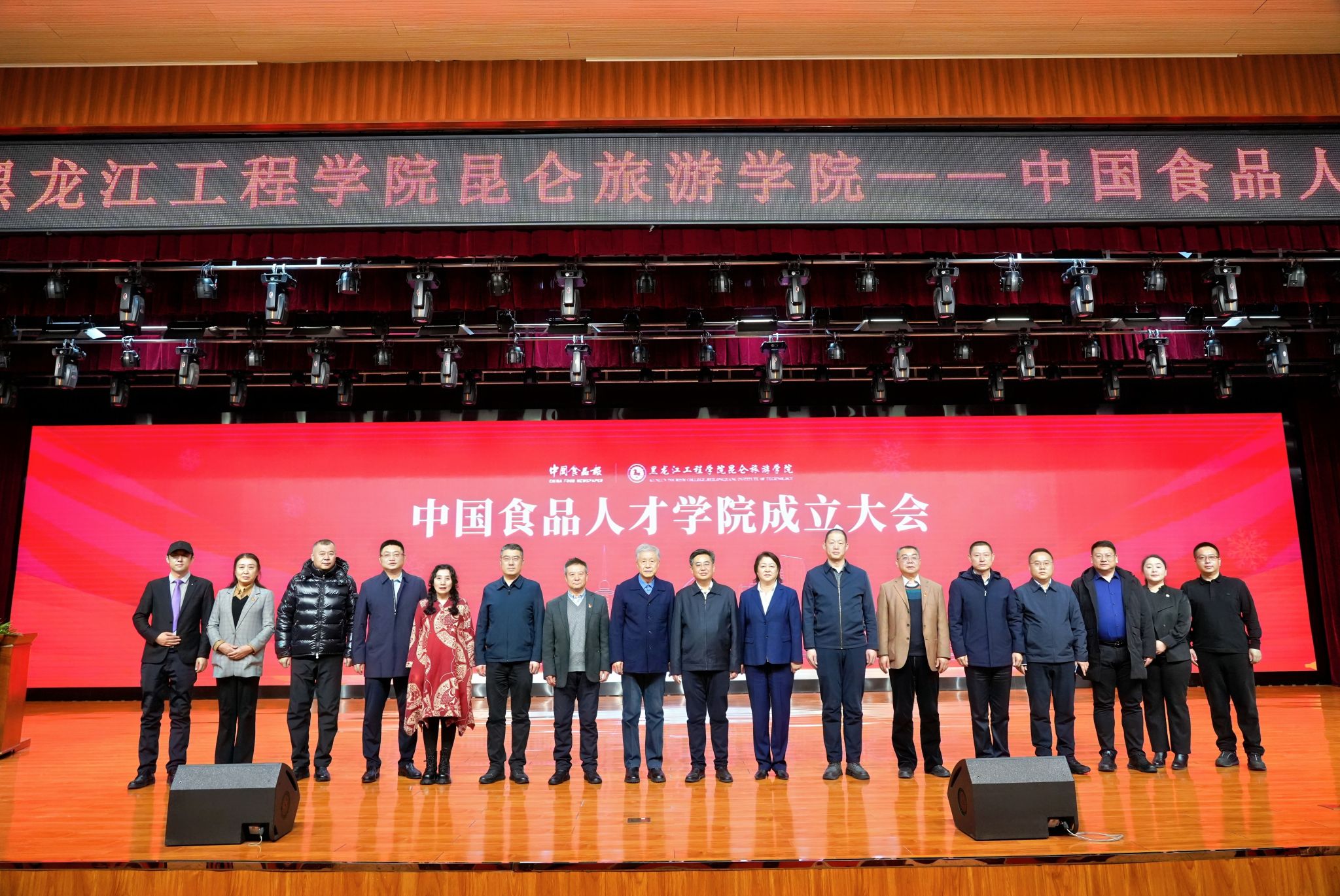 雪舞冰封孕育无限生机,产教融合共绘发展蓝图。12月25日上午,我校与中国食品报社共建“中国食品人才学院”成立大会在学校群观楼五楼报告厅隆重举行。中国食品报社社长黄国胜、主任赵锋,黑龙江省教育厅学生处一级调研员崔志伟,黑龙江省大学生就业创业指导中心就业创业服务部部长孙庆彬,宾县委宣传部部长肖春生、宾县旅游事业发展中心主任费江涛、昆仑教育集团董事长汪洋、学校理事长王为正、党委书记刘金伟、校长李英杰、执行校长栾天等领导共同出席大会。学校部分中层干部及师生代表参加活动,会议由党委副书记、副校长武录齐主持。
