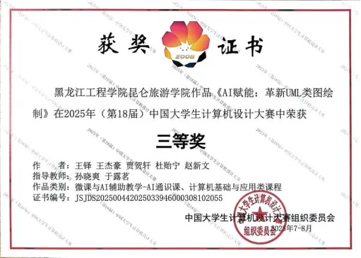 在7月22日至26日于南京大学举行的第18届中国大学生计算机设计大赛全国总决赛中,由我校计算机科学系孙晓爽、于露茗教师指导,王铎、王杰豪等同学完成的作品《AI赋能:革新UML类图绘制》,在“微课与AI辅助教学”赛道中荣获国家级三等奖。