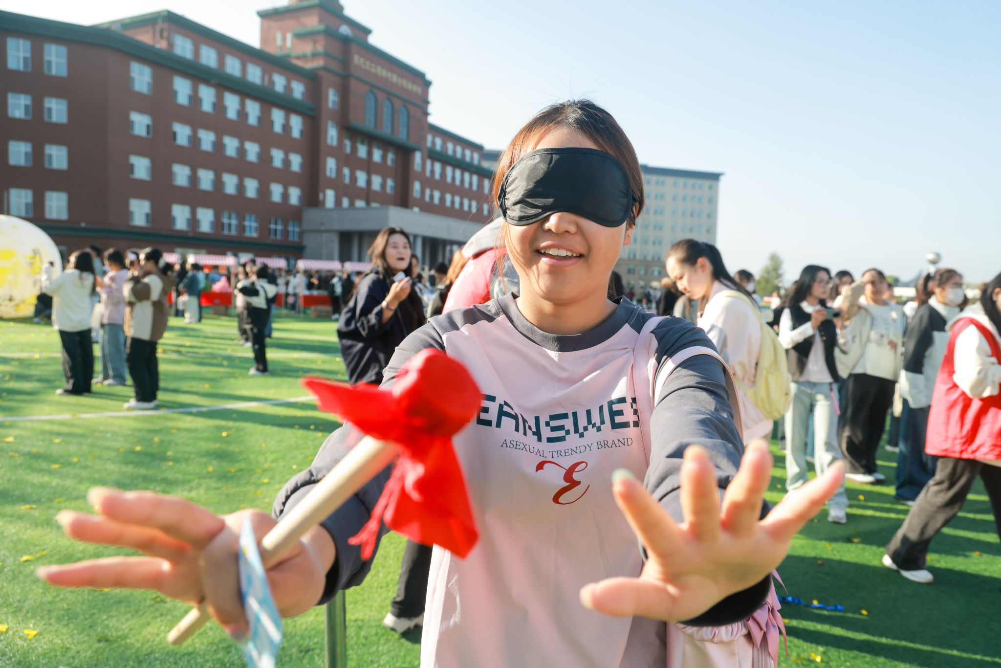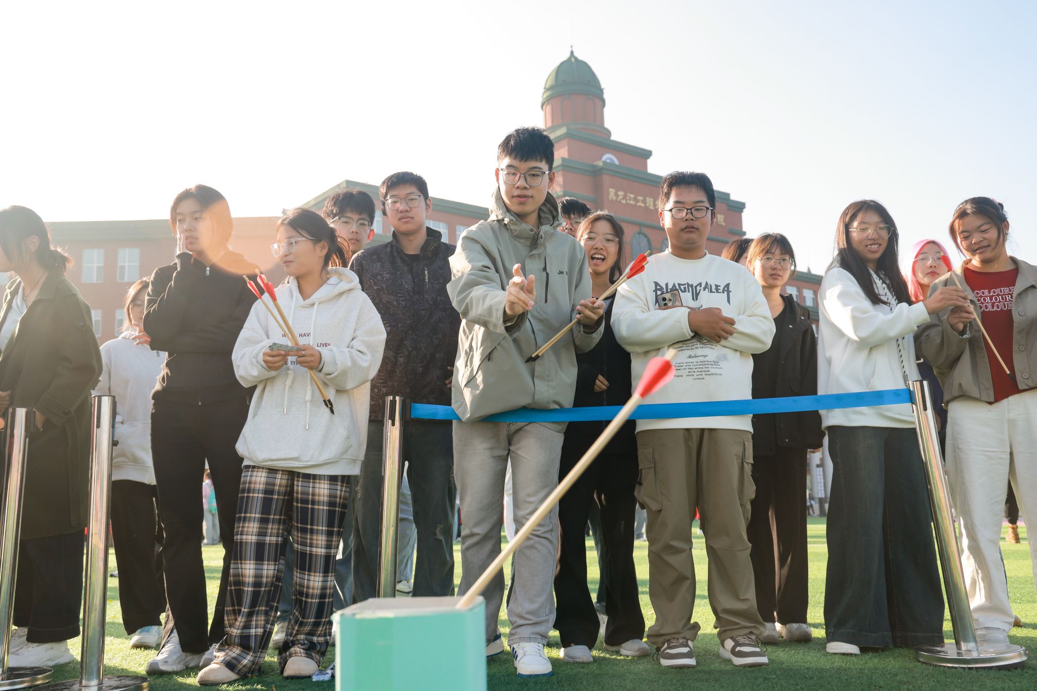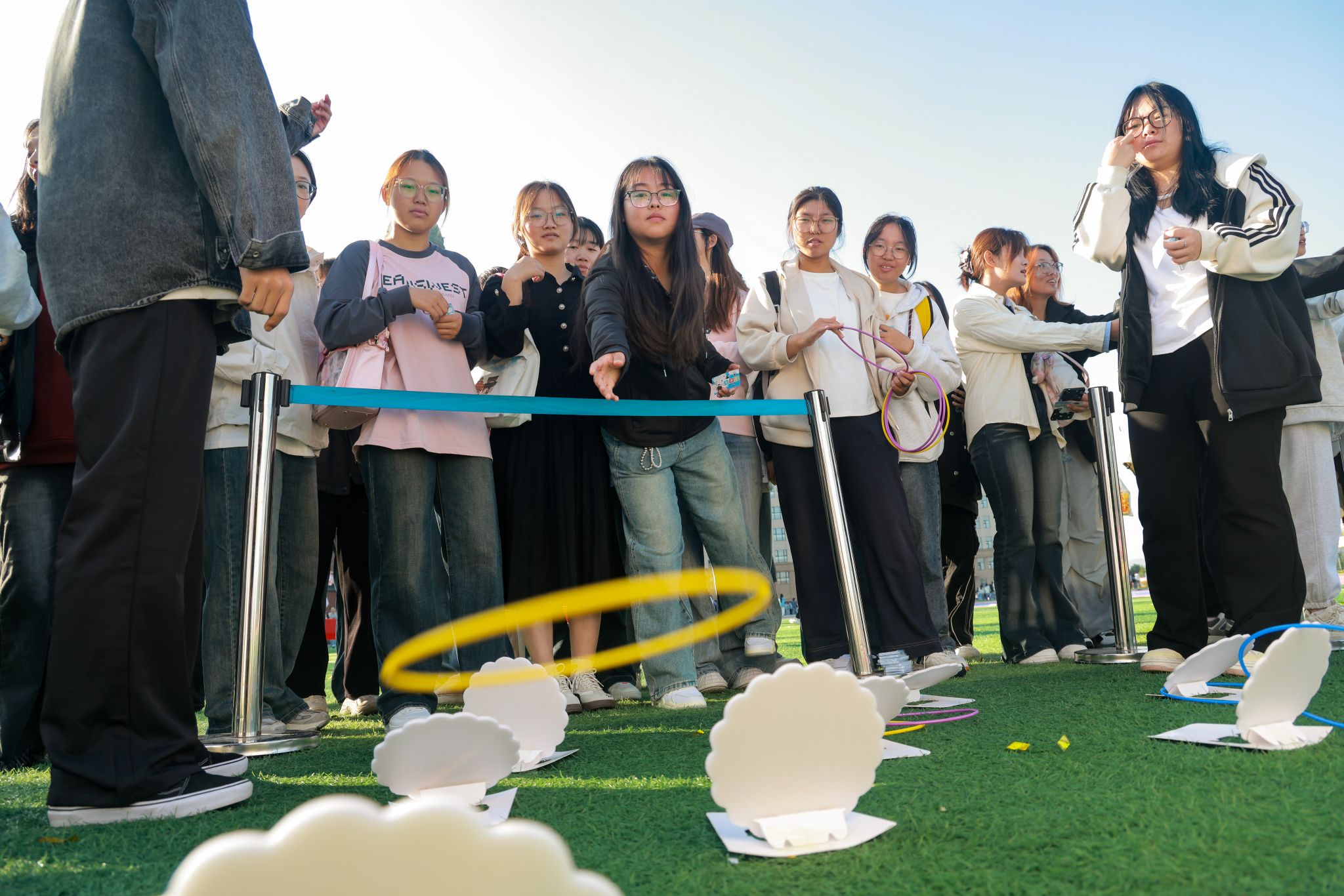 操场上同时设置了多项传统游戏体验区。"玉兔投壶"区,我校学生凝神投掷,箭矢每一次成功入壶都会引来阵阵欢呼;"圈住好运"区,学生们巧妙地抛出手中的套圈,试图套住"兔子"形目标;"蒙眼敲锣"区则充满了欢声笑语,参与者蒙眼旋转后尝试敲锣的滑稽动作引来阵阵笑声。我校师生踊跃参与各项游戏,现场气氛热烈。