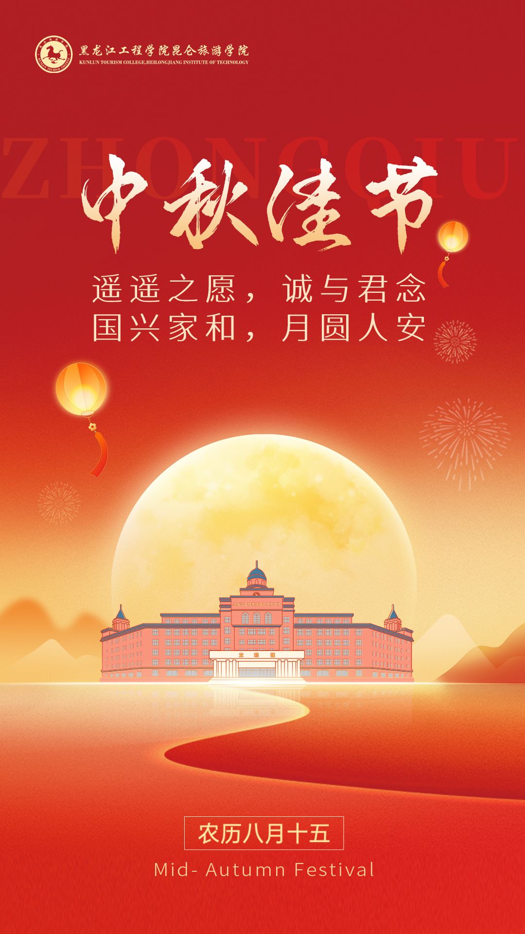 🌕 一轮明月映照昆仑山色,万千祝福汇聚节日深情。值此金风送爽、丹桂飘香的中秋佳节,黑龙江工程学院昆仑旅游学院向全体师生,送上最温暖的节日问候!