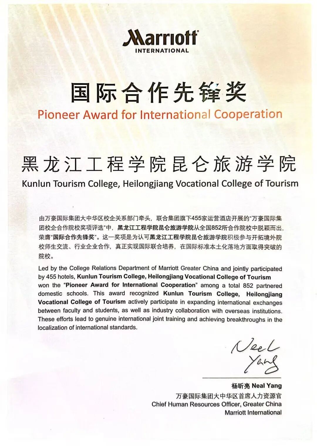 喜报 | 我校旅游管理系荣获万豪国际集团“国际合作先锋奖”