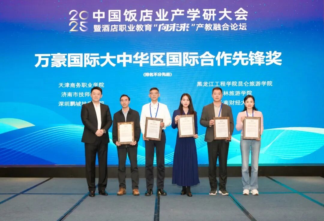 在2025年11月5日至6日于青岛酒店管理职业技术学院隆重举行的中国饭店业产学研大会暨酒店职业教育“向未来”产教融合论坛上,我校旅游管理系凭借在产教融合与国际合作方面的卓越成果,荣膺万豪国际集团大中华区颁发的“国际合作先锋奖”。系主任李辉作、副主任刘林舒代表我校出席了本次行业盛会并领奖。