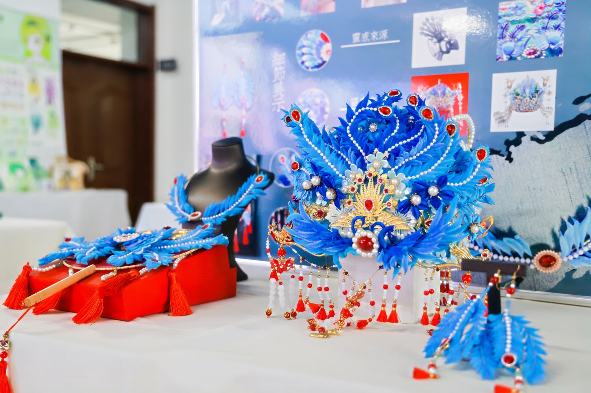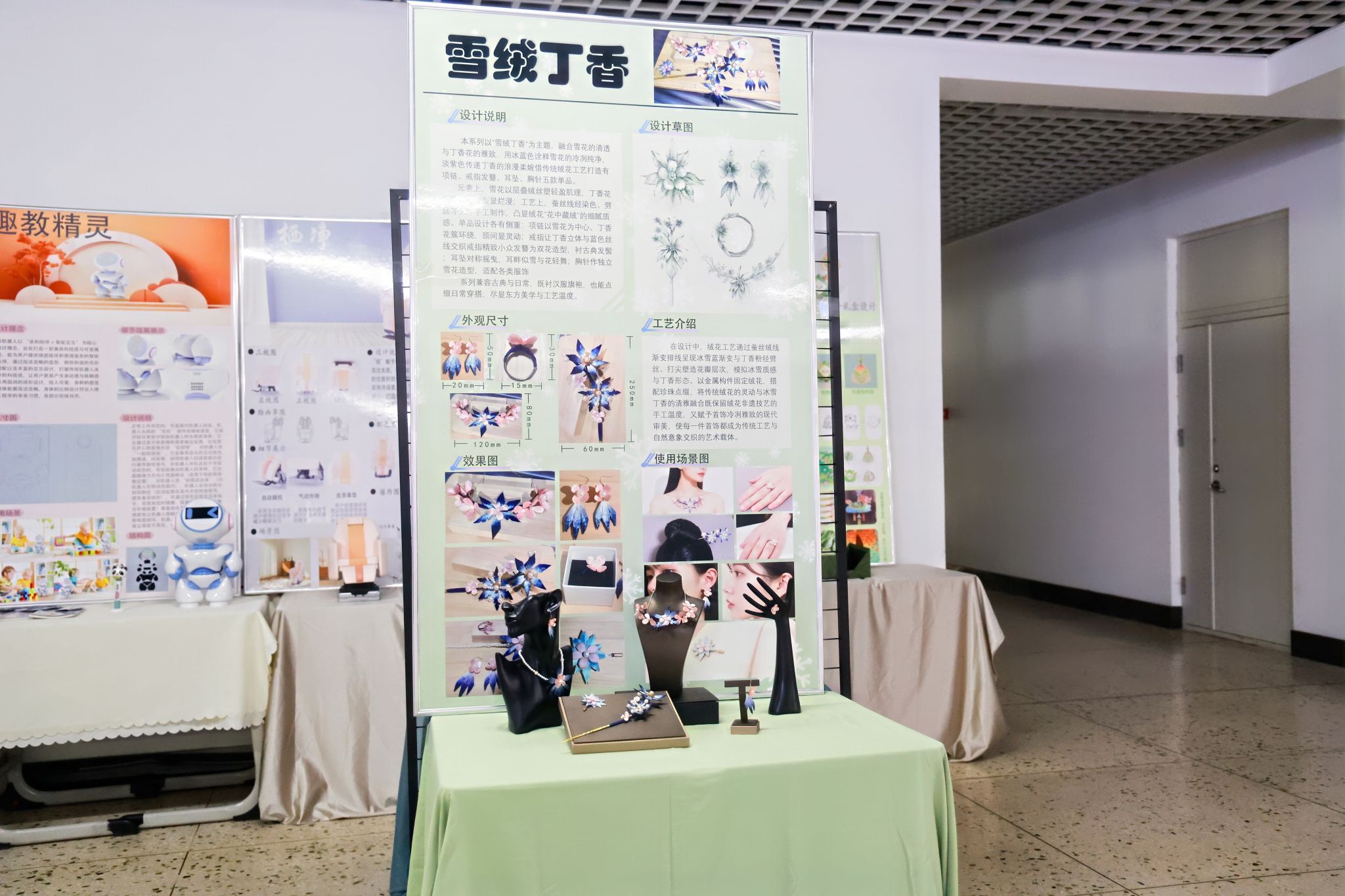 展览现场,一组名为《雪绒丁香》的首饰吸引了不少目光。学生将哈尔滨的冰雪与市花丁香“佩戴”在身上。他们不仅要设计造型,还要研究如何用传统绒花工艺实现轻盈的冰雪质感。一位参与设计的学生说:“最难的不是画图,而是让作品既有地域文化的味道,又能被今天的人喜欢和佩戴。”