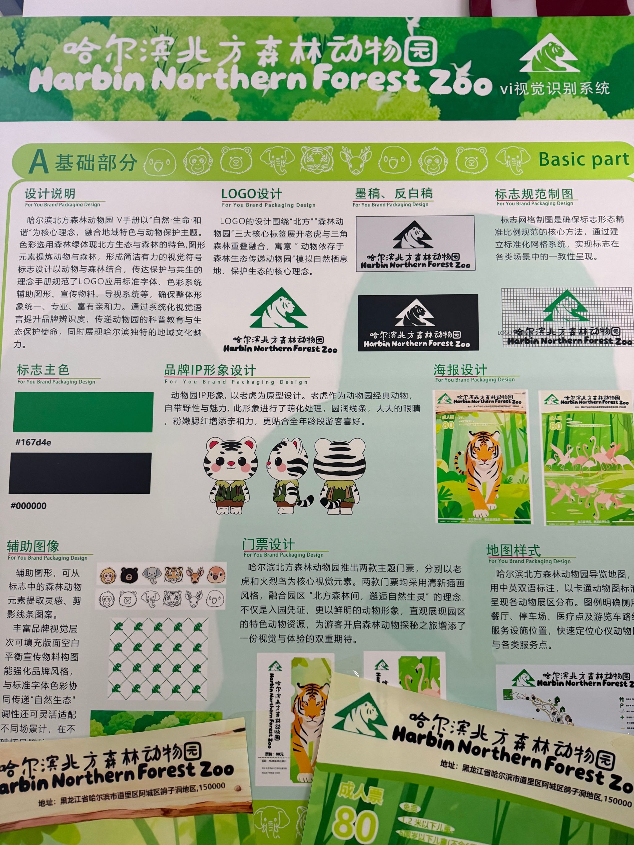 另一项作品,是学生为哈尔滨北方森林动物园完成的整套品牌设计。从Logo、IP形象到门票、地图,学生们需要像真正的设计公司一样,考虑品牌传播、游客体验和实际制作规范。负责IP形象设计的同学坦言:“老师给的意见很直接,要‘可爱,让人想合影’。这让我们明白,设计不能只停留在自己觉得好看。”