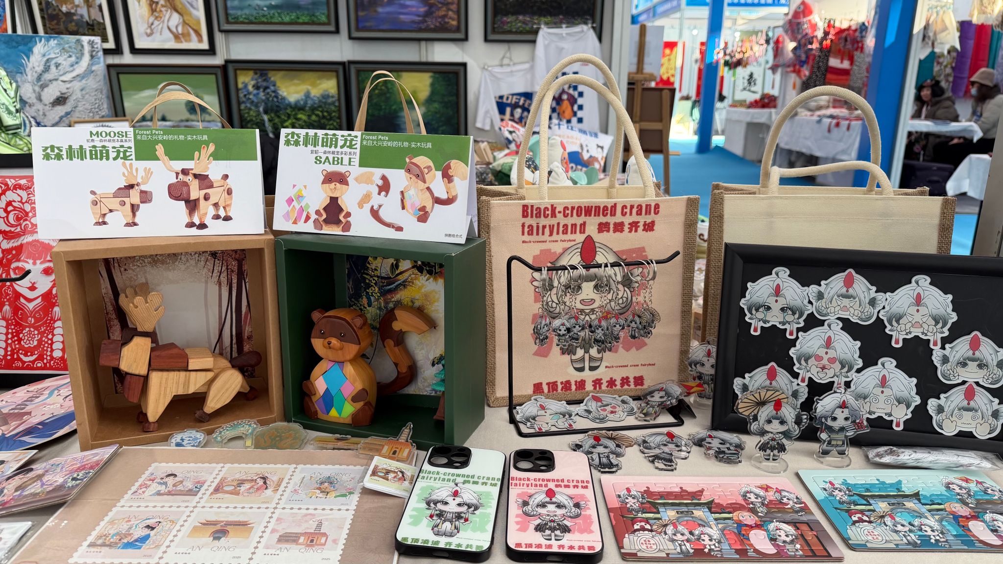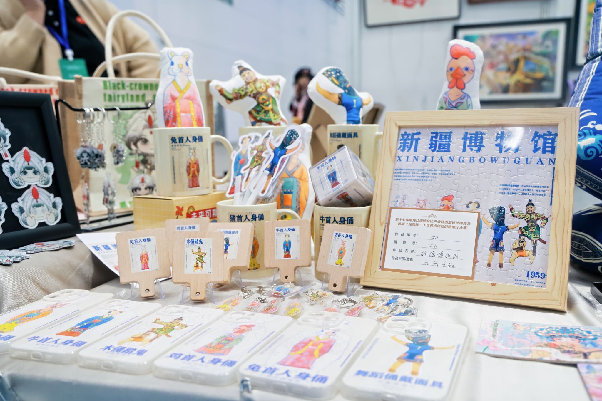 在展会现场,我校艺术系展区吸引了大量观众驻足。展品主要为学生的毕业设计及文创作品。其中,以新疆博物馆馆藏文物为灵感设计的系列文创,将历史纹样与现代日用文具相结合,展现了同学们对传统文化的创新诠释。更引人注目的是扎根龙江本土文化的设计:松峰山鹿苑主题系列作品将小鹿形象进行萌趣化设计,应用于折扇、丝巾等实用物品;齐齐哈尔扎龙湿地白鹤形象则被创作为“白鹤男孩”“白鹤女孩”卡通角色,并衍生出摆台、钥匙链、拼图、手机壳等多种产品。这些作品兼顾艺术美感与实用功能,获得了现场观众的喜爱。