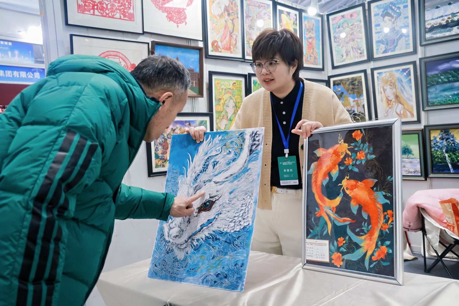学生的创意不仅赢得了人气,更获得了市场的认可。伊春汤旺河旅游景区工作人员在现场与我校艺术系主任于向东进行接洽,认为这些作品特色鲜明,贴合年轻消费者审美,表达了共同开发景区文创产品的初步合作意向。同时,道里区新华书店在现场采购了我校学生的部分文旅产品,并计划在其店面显要位置设立专属展销区。书店方还特别表示,希望采购艺术系教师创作的、展现龙江风貌的油画作品。