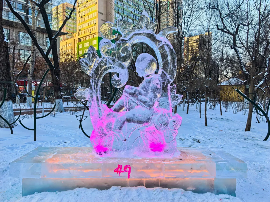 “我们想做点不一样的东西,想让人们看见冰层之下涌动的生机。”这是同学们为作品赋予《冰涧栖春》《书间生息》《冰藤里的青芒》这样名字的初衷。在零下二十度的环境中,他们执意雕琢藤蔓、羽翼这些充满生命张力的意象。“冰是冷的、凝固的,但我们想让它‘活’起来,展现出生长感和温度。”环境设计专业的田庆瑾同学解释道。他刚刚在大庆的“第八届黑龙江省高校冰灯冰雕技艺大赛”中,与队友完成了创作后,又立刻转战哈尔滨兆麟公园,参加“第二十三届黑龙江省大学生冰雕艺术设计创作大赛”。这种连轴转的参与,动力正是源于将纸上画稿变为剔透现实的强烈渴望。