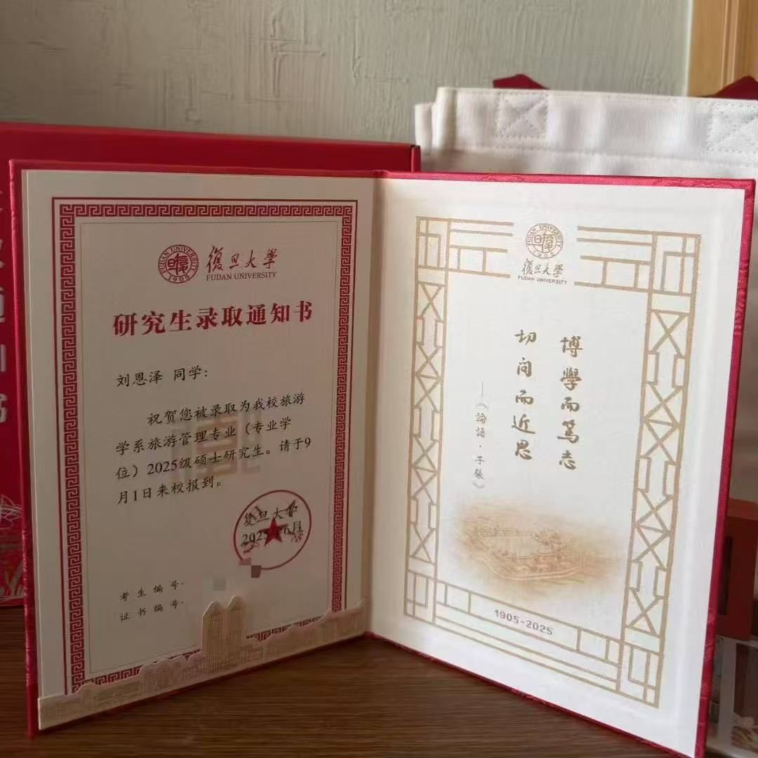 刘恩泽没有退缩。他给自己定下了严格的计划:清晨五点,闹钟一响,宿舍里就响起他背单词、看真题的声音。午休时间短暂,同事们休息,他却捧着厚厚的专业书看得入神。上下班通勤的路上,耳机里听的是专业课讲解。夜深人静时,他还在灯下回顾当天的学习内容。一本本被翻旧的书,一支支用完的笔芯,记录着他那段“白天拼业绩,晚上啃书本”的拼搏日子。正是这份在昆仑旅游学院养成的韧劲,加上在职场中磨砺出的强大执行力,让他在竞争激烈的2025年全国硕士研究生招生考试中脱颖而出,成功被复旦大学旅游管理专业录取。喜讯传来,他第一时间将这份喜悦和深深的谢意,传递给了千里之外的母校——黑龙江工程学院昆仑旅游学院,特别是辅导员李春燕老师:“感谢母校的栽培,感谢旅游管理系老师的教导!是昆仑给我打下的基础,是酒店工作锻炼出来的能力,支撑着我一步步走到今天。”话语朴实,情意真切。